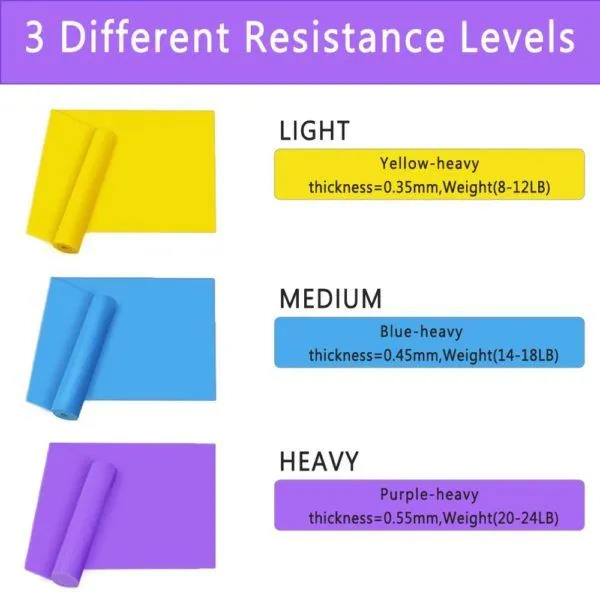 Set od tri elastične vrpce dužine 150 cm (žuta, plava i ljubičasta) uključuje različite razine otpora: Light, Medium i Heavy. Idealan je za fitness i pilates vježbe, jačanje i tonifikaciju mišića, zagrijavanje te pripremu sportaša za natjecanja.
